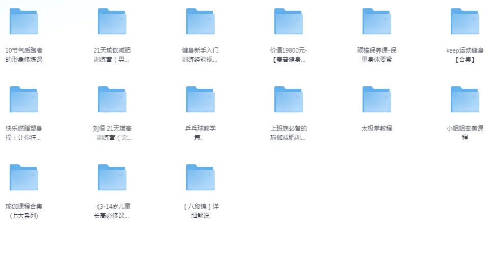 付费健身VIP课程大合集课程资源。 价值19800元【赛普健身专业视频】 瑜伽课程合集(七大系列) 小姐姐变美课程 keep运动健身【合集】 [八段锦]详细解说 《314岁儿童长高必修课》北京协和医院教授潘慧 21天瑜伽减肥训练营(男女适用) 10节气质跑者的形象修炼课 颈椎保养课保重身体要紧 上班族必备的瑜伽减肥训练营【完结】 乒乓球教学篇。 太极拳教程 健身新手入门训练经验视频课程 快乐燃脂塑身操:让你狂力甩肉,越跳越瘦! 刘恒 21天增高训练营(完结) ├── 付费class | ├── 腹肌 | ├── 马甲线 | ├── 美臀 | ├── 跑步 | ├── 燃脂 | ├── 手臂 |…...