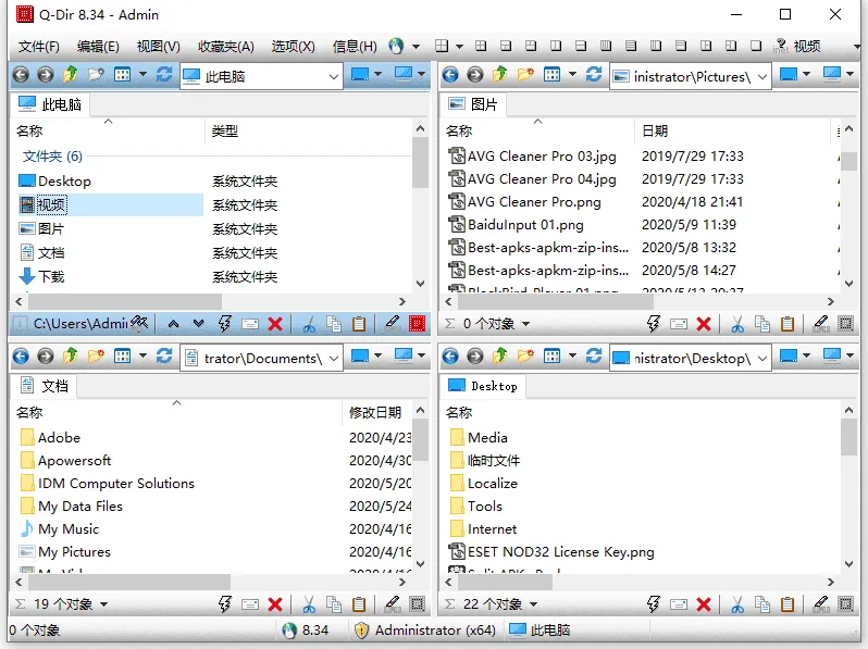 Q-Dir 是一款非常独特的资源管理器,特别适用于频繁在各个目录间跳跃复制粘贴的情况,因为,它有 4 个窗口!每个窗口都可以方便的切换目录,以不同颜色区分不同类型的文件,各窗口之间可以方便的拖放操作互相的文件。