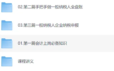 一般纳税人全盘账务处理与纳税申报,包括课程讲义、第一篇会计上岗必备知识、第二篇手把手做一般纳税人全盘账、第三篇一般纳税人企业纳税申报。 ├── 01.第一篇会计上岗必备知识 ├── 02.第二篇手把手做一般纳税人全盘账 ├── 03.第三篇一般纳税人企业纳税申报 ├── 课程讲义...