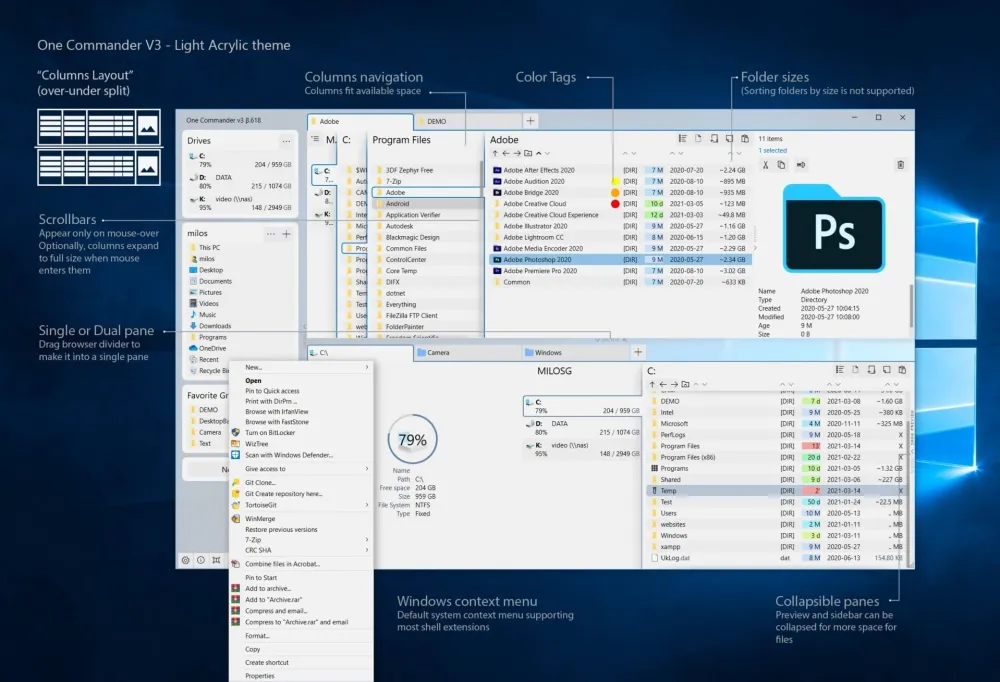 One Commander 3 是一款 Windows 下的文件管理器工具,支持多栏、多主题、多套图标、文件预览、色彩标签、彩色新旧文件识别等功能,高自定义,家庭用户可免费使用。在志愿者(如 @Krysl)的努力下,目前 One Commander 3 已内置简体中文。