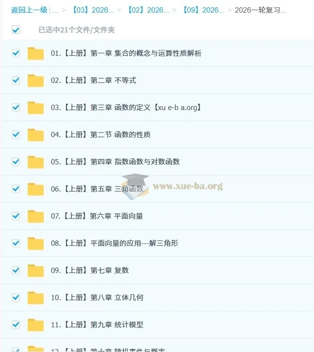 2025高三高考数学 宋超 一轮复习 目录: 01【一轮复习—】函数(第一章---第六章)【题型全攻略】 01【第一章】集合的概念与运算性质解析~1.mp4 02【第二章】2.1 函数与映射概念区别(新高考不考)~1.mp4 03【第二章】2.2 定义域 6 个考点~1.mp4 04【第二章】2.3 抽象函数定义域~1.mp4 05【第二章】2.4 分式值域的三种考法~1.mp4 06【第二章】2.5 判别式法求值域(技巧)~1.mp4 07【第二章】2.6 范围法求值域(技巧)~1.mp4 08【第二章】2.6 根式求值域(技巧)~1.mp4 09【第二章】2.7 对勾函数~1.mp4 10…...