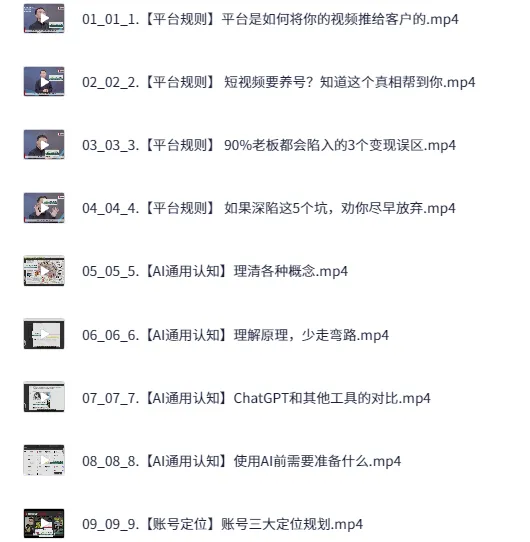 AI+短视频获客快训营+剪辑课。 想借短视频开辟财富通道? 别错过 AI + 短视频获客快训营! 100 节课程全流程覆盖,从平台规则、账号搭建,到 AI 工具运用、内容创作与剪辑实操,系统教学。 借助 AI 智能找对标、写脚本、做剪辑,零基础也能快速上手,开启短视频流量变现新篇 。 ├── 01_01_1.【平台规则】平台是如何将你的视频推给客户的.mp4 ├── 02_02_2.【平台规则】 短视频要养号?知道这个真相帮到你.mp4 ├── 03_03_3.【平台规则】 90%老板都会陷入的3个变现误区.mp4 ├── 04_04_4.【平台规则】 如果深陷这5个坑,劝你尽早放弃.mp4 …...