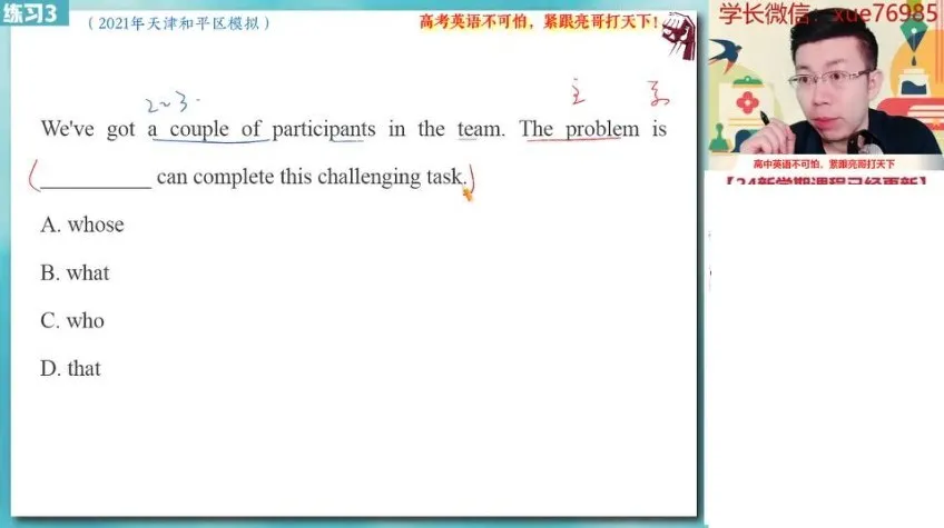 本课程为张亮老师专为高二学生设计的英语冲顶系统课,涵盖阅读技巧(因果题/观点态度题)、七选五、读后续写(友情/历险类)、名词性从句等16大核心模块。包含45讲高清视频+配套课堂笔记,通过同源外刊精读、热点话题解析(传统文化/环保)、题型精练三管齐下,帮助学生快速掌握高考英语命题规律。秋季班特别强化写作(图表/通知类)和语法填空训练,配套5套期中期末复习资料,适合想系统提升英语能力的高二学生。