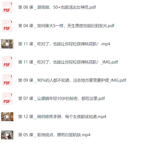 名称:女性必备护肤课,带你轻松养出逆龄好肌肤 描述:女性必备护肤课,带你轻松养出逆龄好肌肤(完结) 094女性必备护肤课,带你轻松养出逆龄好肌肤(完结) 第 1 课 _ 远离护肤谣言,用科学的方法养出好肌肤.mp4 第 1 课 _ 远离护肤谣言,用科学的方法养出好肌肤.pdf 第 10 课 _ 做好头皮护理,还能再年轻5岁.mp4 第 10 课 _ 做好头皮护理,还能再年轻5岁1.pdf 第 11 课 _ 吃对了,也能让你轻松获得桃花肌!).mp4 第 11 课 _ 吃对了,也能让你轻松获得桃花肌!1.pdf 第 12 课 _ 辣妈修炼手册,每个女孩都该知道.mp4 第 12 课 _ 辣妈修炼…...