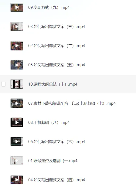 新手0基础入门做影视解说培训。 这个新手 0 基础入门培训课程旨在帮助初学者掌握影视解说的基本技巧。通过系统的理论讲解和实践演练,学员将学会如何提高嗓音、表达技巧和声音处理。这个课程将为您提供必要的知识和技能,成为一名出色的影视解说员! ├── 01.账号定位及选剧(一.mp4 ├── 02.如何写出爆款文案(二).mp4 ├── 03.如何写出爆款文案(三).mp4 ├── 04.如何写出爆款文案(四).mp4 ├── 05.如何写出爆款文案(五).mp4 ├── 06.如何写出爆款文案(六).mp4 ├── 07.素材下载和解说配音,以及电脑剪辑(七).mp4 ├── 08.手机剪辑(八)…...