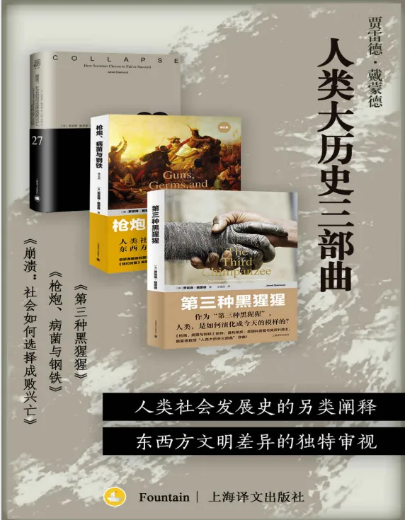 人类大历史三部曲》按时间顺序分别收录《第三种猩猩》《枪炮、病菌与钢铁》《崩溃:社会如何选择成败兴亡》共3册,感受戴蒙德教授对人类社会发展史的另类阐释和对东西方文明差异的独特审视。 《第三种黑猩猩 : 人类的身世与未来(完整版)》(豆瓣评分:8.7) 人不同于禽兽,毋庸置疑;人是一种大型哺乳类动物,亦毋庸置疑。 根据现代遗传学研究,我们与另外两种黑猩猩的基因组,有98%是相同的。若有从外太空来的动物学家,一定会毫不犹豫地将人归类成“第三种黑猩猩”。我们对人类并不陌生,但是,人类是怎样演化成今天的模样的?人之所以为人,又是哪些关键因素的杰作? 全书分成五个部分讨论,回顾了人类的兴亡史。人类从动物界…...