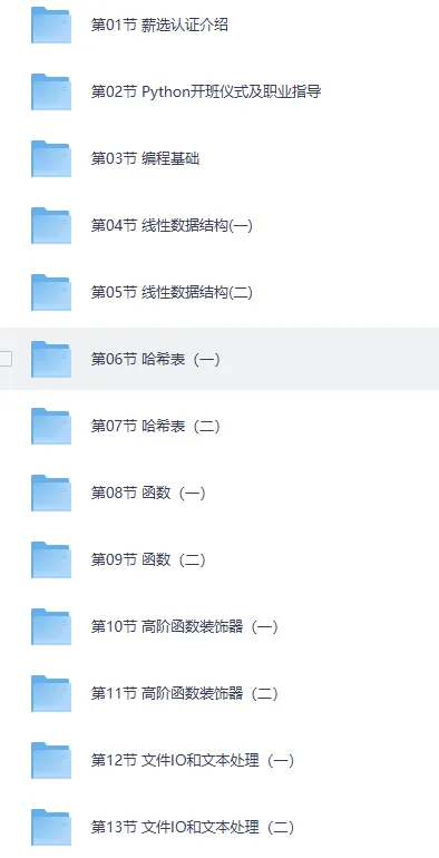 马哥教育《Python全栈+爬虫+数据+AI课程》,内容全面,从入门到精通,满足不同层次的学习需求;实战导向,结合实际案例,让你在学习中积累经验。学会它,就能成为Python全能工程师。资源,免费下载。 ├── 第01节 薪选认证介绍 ├── 第02节 Python开班仪式及职业指导 ├── 第03节 编程基础 ├── 第04节 线性数据结构(一) ├── 第05节 线性数据结构(二) ├── 第06节 哈希表(一) ├── 第07节 哈希表(二) ├── 第08节 函数(一) ├── 第09节 函数(二) ├── 第10节 高阶函数装饰器(一) ├── 第11节 高阶函数装饰器(二) ├──…...