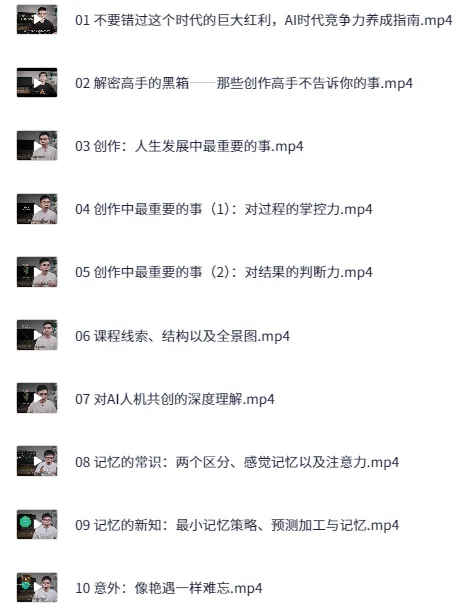 高手的黑箱:AI时代学习与创作。 高手的黑箱:AI时代学习与创作课程,这套 37 讲的视频课程围绕“AI 时代的个人竞争力”展开,从创作方法、认知科学到知识管理,为内容创作者、职场人士和学习者提供系统化成长路径。标题本身已暗示两大核心:一是掌握 AI-辅助工具带来的效率红利,二是通过认知升级提升创作深度。 ├── 01 不要错过这个时代的巨大红利,AI时代竞争力养成指南.mp4 ├── 02 解密高手的黑箱——那些创作高手不告诉你的事.mp4 ├── 03 创作:人生发展中最重要的事.mp4 ├── 04 创作中最重要的事(1):对过程的掌控力.mp4 ├── 05 创作中最重要的事(2):对…...