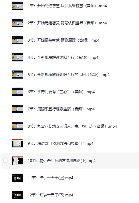 参透易经奇门玄学预测22门技术的逻辑并学会应用,课程。课程通过丰富的视频讲解与详实的PDF笔记,系统阐释易经奇门玄学中22门核心预测技术及其应用。内容涵盖奇门通甲核心预测与找用神思路、数字号码预测、易经智慧理念、阴阳五行解读及天干地支、八门八神理论。同时提供典型预测场景的实操案例,包括婚姻预测、终生局分析、环境风水布局和个人运势解析。课程内容兼顾基础入门与中高级干货,融入量子纠缠等新视角,对商业机会预判和风险防范提供参考,为从易经新手到资深预测者搭建了全面提升预测与决策能力的知识体系。...