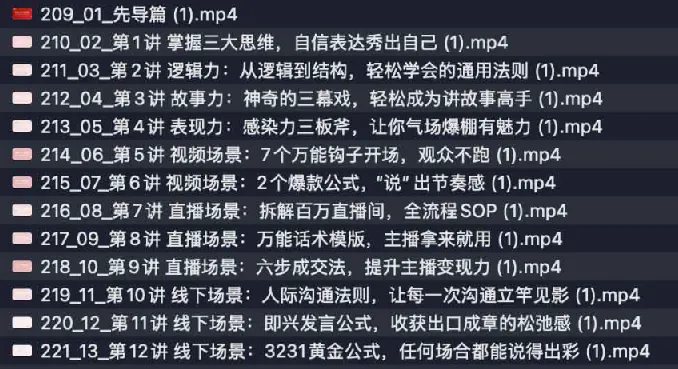 超级个体全景表达课,成为超级个体,用表格拿结果。 超级个体全景表达课,成为超级个体,用表格拿结果,你是否渴望表达却总被心理障碍束缚?这门全景表达课专为打破”想讲不敢讲”的困局设计,助你跨越3大思维误区,从胆怯走向自信表达。课程提炼3大表达基本功与1套黄金演说稿公式,即学即用,让线上短视频、直播到线下沟通全面开花,用表达力实现个人价值变现。 ├── 209_01_先导篇 (1).mp4 ├── 210_02_第1讲 掌握三大思维,自信表达秀出自己 (1).mp4 ├── 211_03_第2讲 逻辑力:从逻辑到结构,轻松学会的通用法则 (1).mp4 ├── 212_04_第3讲 故事力:神奇的三…...