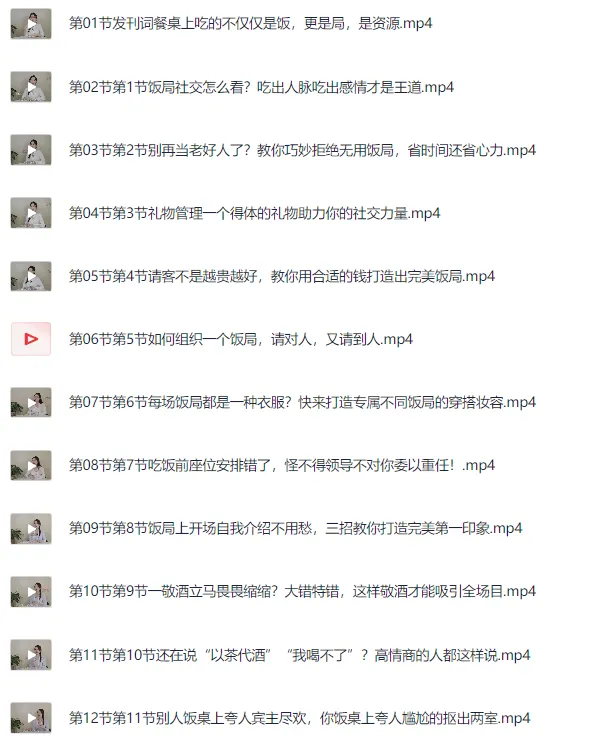 27项餐桌社交全攻略圈总教你会说话、会办事、办成事。 本课程由餐桌社交专家圈总亲授,深挖中国社交文化中的饭局精髓,教你如何在各类饭局中运用高情商,成为会说话、会办事、办成事的人。无论是同事、领导、商务还是家庭饭局,课程都将为你提供实用的攻略和技巧,让你在饭局上吃得开、赢得人脉、获得合作机会,甚至成为人生转折点。从此打开广阔新天地,成为社交达人。 ├── 第01节发刊词餐桌上吃的不仅仅是饭,更是局是资源.mp4 ├── 第02节第1节饭局社交怎么看?吃出人脉吃出感情才是王道.mp4 ├── 第03节第2节别再当老好人了?教你巧妙拒绝无用饭局,省时间还省心力.mp4 ├── 第04节第3节礼物管理…...