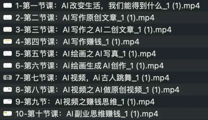 AI改变生活(Ai写作+AI绘画+Ai视频),AI副业挣钱,这套课程聚焦AI在个人创作和副业中的应用,内容涵盖AI写作、AI绘画和AI视频等多个方向,帮助学习者掌握从工具使用到变现思维的全流程。无论是希望写出原创文章,还是借助AI生成图片、视频,再到结合副业赚钱模式,课程都提供了完整的思路与操作路径。