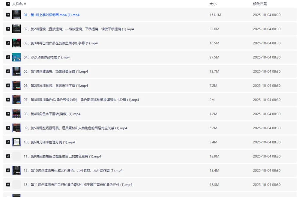 沙沙动画全套课程,教你一部手机零基础制作动画视频,本课程系统整理了沙沙动画的完整教学视频,涵盖从零基础入门到进阶应用的全流程。学习者将掌握画布创建、角色搭建、运镜技巧、配音处理、特效制作、AI生成素材应用等多维度技能,适合希望用手机快速制作动画视频的创作者。