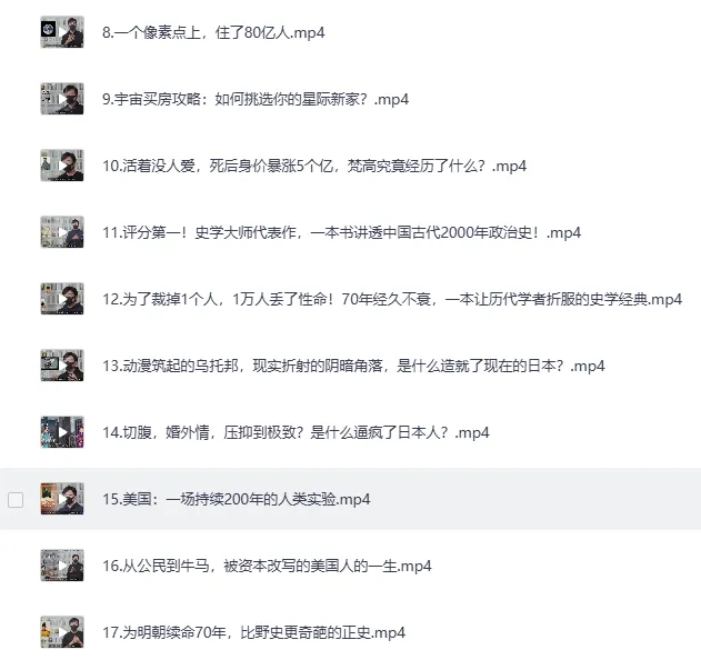 木鱼水心《B站充电专属视频合集》。 哔哩哔哩的电影解说UP主中,个人比较喜欢的就是“木鱼水心” 声音不错,解说细致,比较出圈的视频就有四大名著解说 以及堪比电影时长的《Hello!树先生》解读 后来B站开通充电视频付费项目后,“木鱼水心”也开始加入 《星空读书会》基本上每期节目都是长达一小时左右,干货满满的时长 如果看了视频觉得不错,喜欢请为UP主充值! ├── 1.看懂他,才真正懂得艺术电影有多美!.mp4 ├── 2.他被鲁迅diss,却写透了中国.mp4 ├── 3.与诺奖擦肩,沉浸式体验《边城》中的人性与宿命.mp4 ├── 4.与其内耗,不如发疯?当代年轻人的「情绪自救指南」!.mp…...