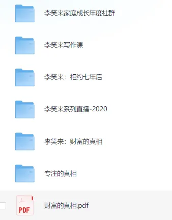 李笑来付费课程资料合集。 ├── 财富的真相.pdf ├── 李笑来家庭成长年度社群 ├── 李笑来系列直播-2020 ├── 李笑来写作课 ├── 李笑来:财富的真相 ├── 李笑来:相约七年后 ├── 专注的真相...