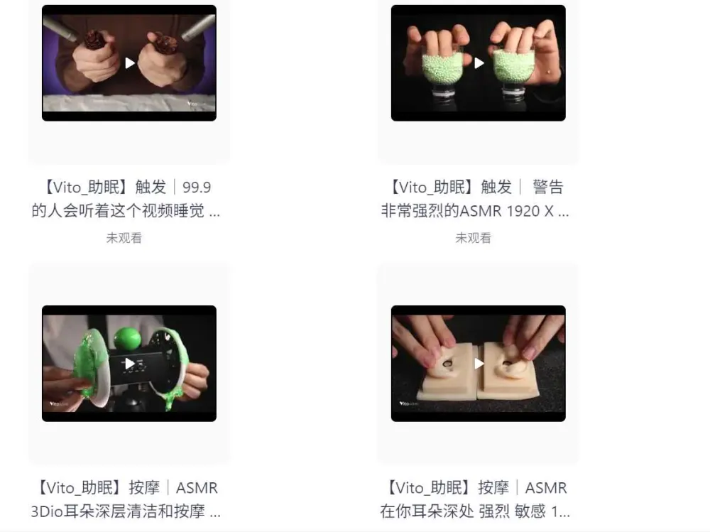 什么是ASMR? 自发性知觉经络反应 ( autonomous sensory meridian response,ASMR) ,又名耳音、颅内高潮等,指人体通过视、听、触、嗅等感知上的刺激,在颅内、头皮、背部或身体其他部位产生的令人愉悦的独特刺激感。 本次分享的这个合集是油管ASMR美女主播 哄睡助眠高清合集 无违规内容 持续更新 ASMR美女主播【Vito_助眠】精选合集5:...