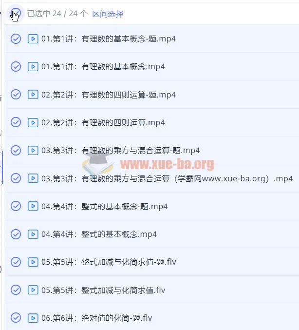 初中数学名师机构课程朱韬2019暑【直播课】六年级升初一数学勤学班(朱韬)-百度网盘资源下载地址由网盘用户[lan****ke3]分享,包含pdf,flv,mp4等格式共计24个文件,文件大小为7.48GB,分享时间2025-02-03,此百度网盘资源由桔子搜网盘搜索引擎收集整理。...