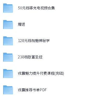b站戎震付费充电视频大合集。 《戎震全部充电视频》人生导师覆认知好东西速存 ├── 50元档等充电视频合集 ├── 128元档祛魅神秘学 ├── 238档致富圣经 ├── 戎震魅力提升付费课程(完结) ├── 戎震推荐书单PDF ├── 赠送...