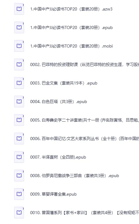 《三良书社高品质好书500册》百科全书式的好书合集。 ├── 1.中国中产JJ必读书TOP20(套装20册).azw3 ├── 1.中国中产JJ必读书TOP20(套装20册).epub ├── 0003. 巴金文集(套装共19本).epub ├── 0004. 白色巨塔(共3册).epub ├── 0005. 白寿彝史学二十讲套装(共十一册 (齐名陈寅恪、吕思勉、翦伯赞,《中国通史》总主编白寿彝史学二十讲系列,囊括《中国通史》及白寿彝史学思想精髓的精华读本,内含精美彩插).epub ├── 0006. 百年中国记忆·文艺大家系列丛书(全十册)(百年中国的文化记忆,带你领略文艺大家的魅力!).e…...